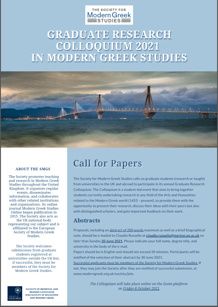 The 2021 Graduate Research Colloquium of the Society for Modern Greek Studies will take place on Zoom on Friday 8 October. Qualified postgraduate and doctoral students are invited to submit proposals by 20 June 2021. Further details can be found on the poster attached.