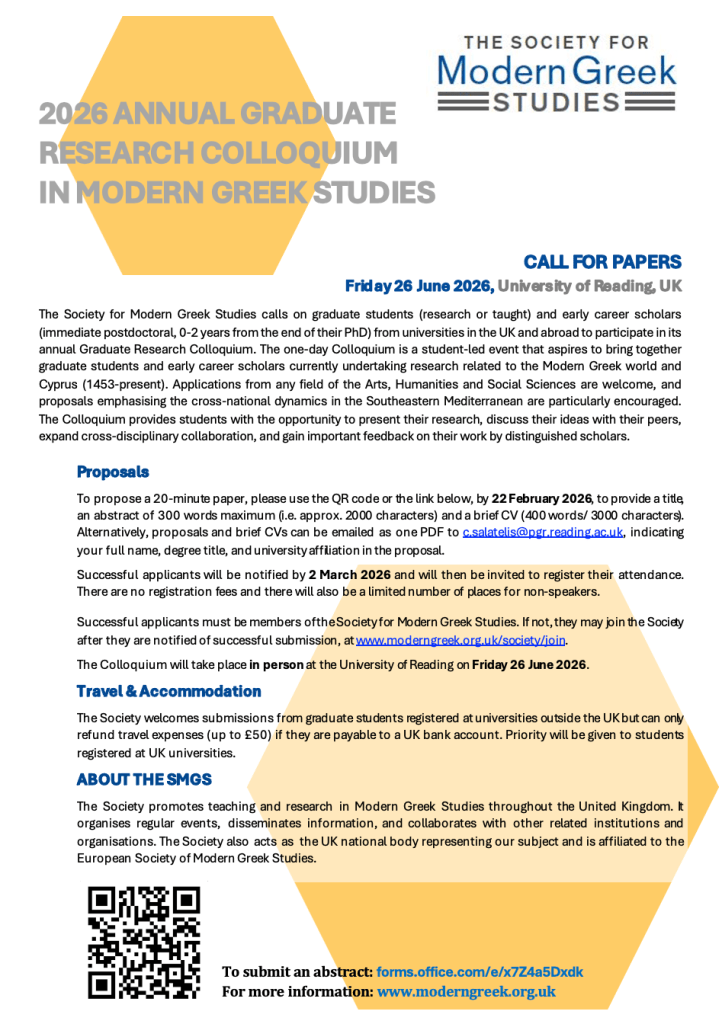 The Society for Modern Greek studies calls on graduate students (research or taught) and early career scholars (immediate postdoctoral, 0-2 years from the end of their PhD) from universities in the UK and abroad to participate in its annual Graduate Research Colloquium, this year taking place in person at the University of Reading (UK) on Friday 26 June 2026 (venue tbc).